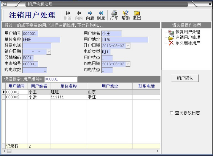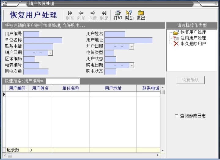 ,鼠標(biāo)左鍵“銷戶恢復(fù)處理”,出現(xiàn)以下對(duì)話框: