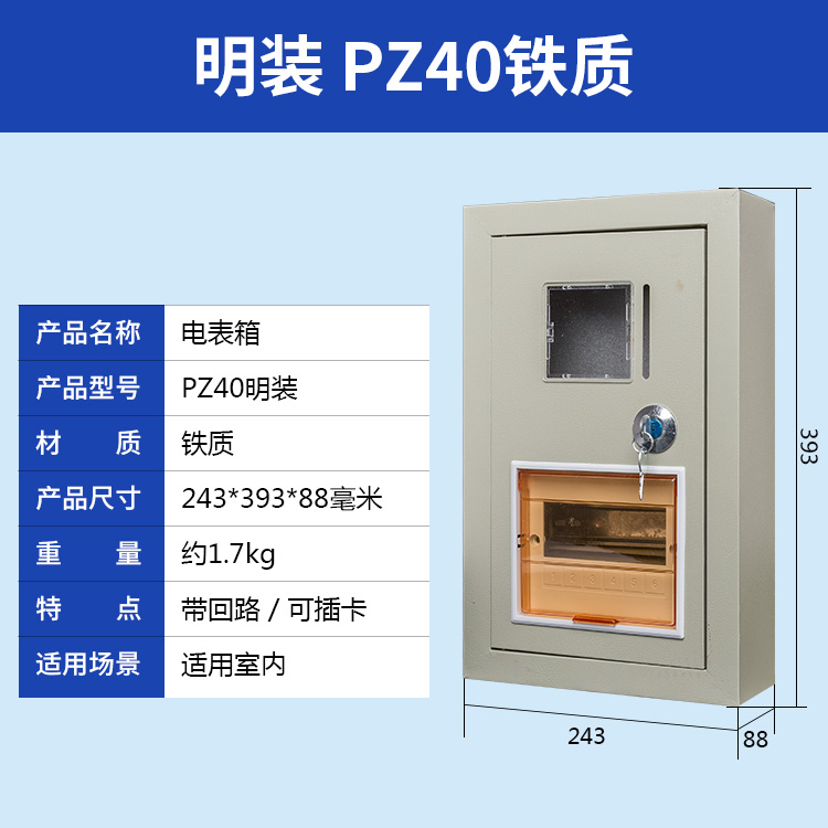 我公司生產的PZ40電表箱采用0.5-1mm厚冷軋鋼板和進口PC高透視窗,并帶有門鎖,安全防盜,大氣美觀??砂惭b各類電能表和C45、空氣開關、斷路器閘刀等,廣泛用于家庭、公寓、學校、工廠等場所。